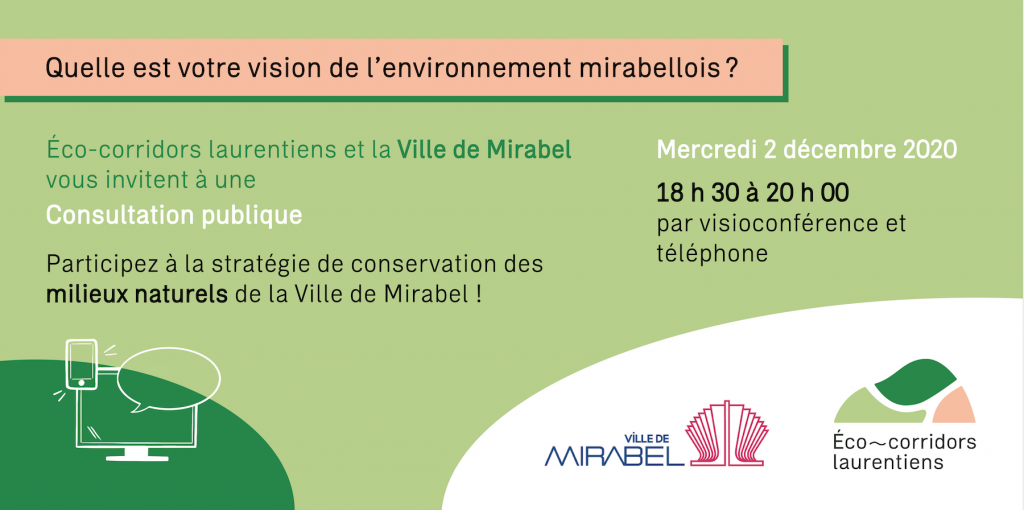 Éco-corridors laurentiens et la Ville de Mirabel vous invitent à une consultation publique virtuelle dans le cadre de l’élaboration d’une stratégie de conservation des milieux naturels de la Ville de Mirabel.